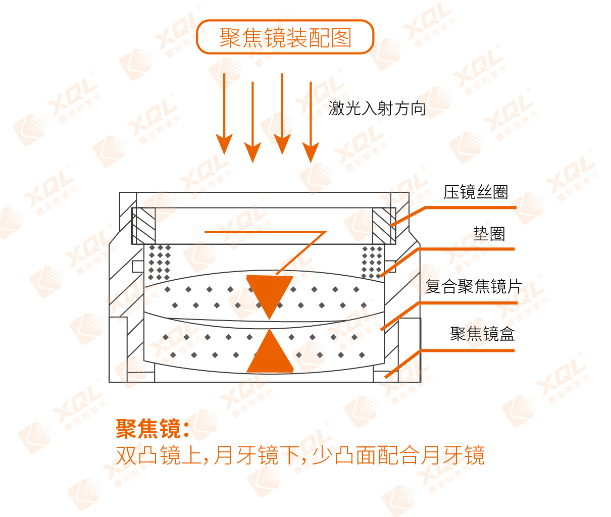 ⒉聚焦凸面朝下(即安裝后朝向保護(hù)鏡方向)