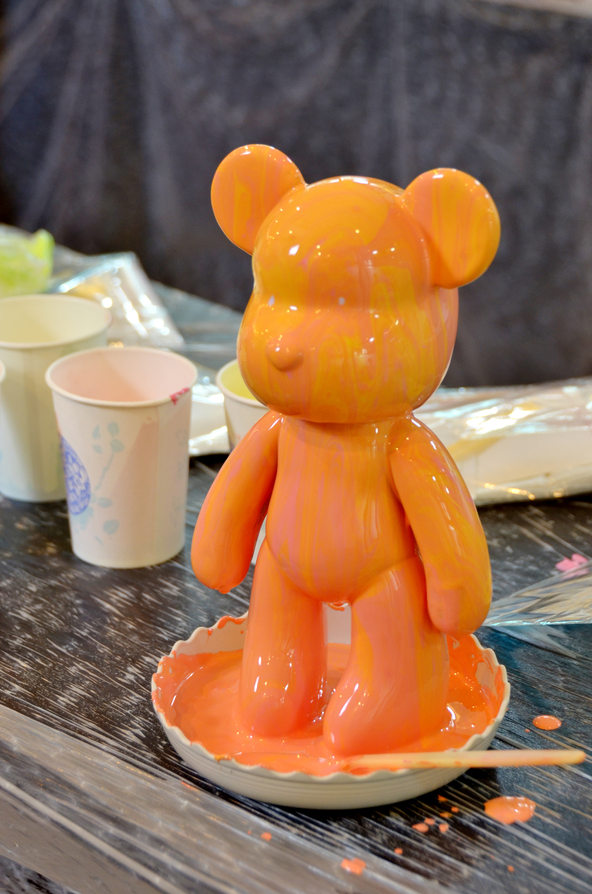將顏料疊加混合,傾注在流體熊上