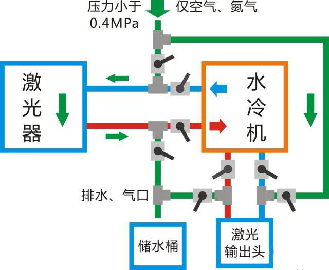 冬季寒冷的天氣下必須對(duì)激光器、激光輸出頭、加工頭及水冷機(jī)內(nèi)所有冷卻水排放干凈才能有效保護(hù)整套水冷管路和相關(guān)器件。